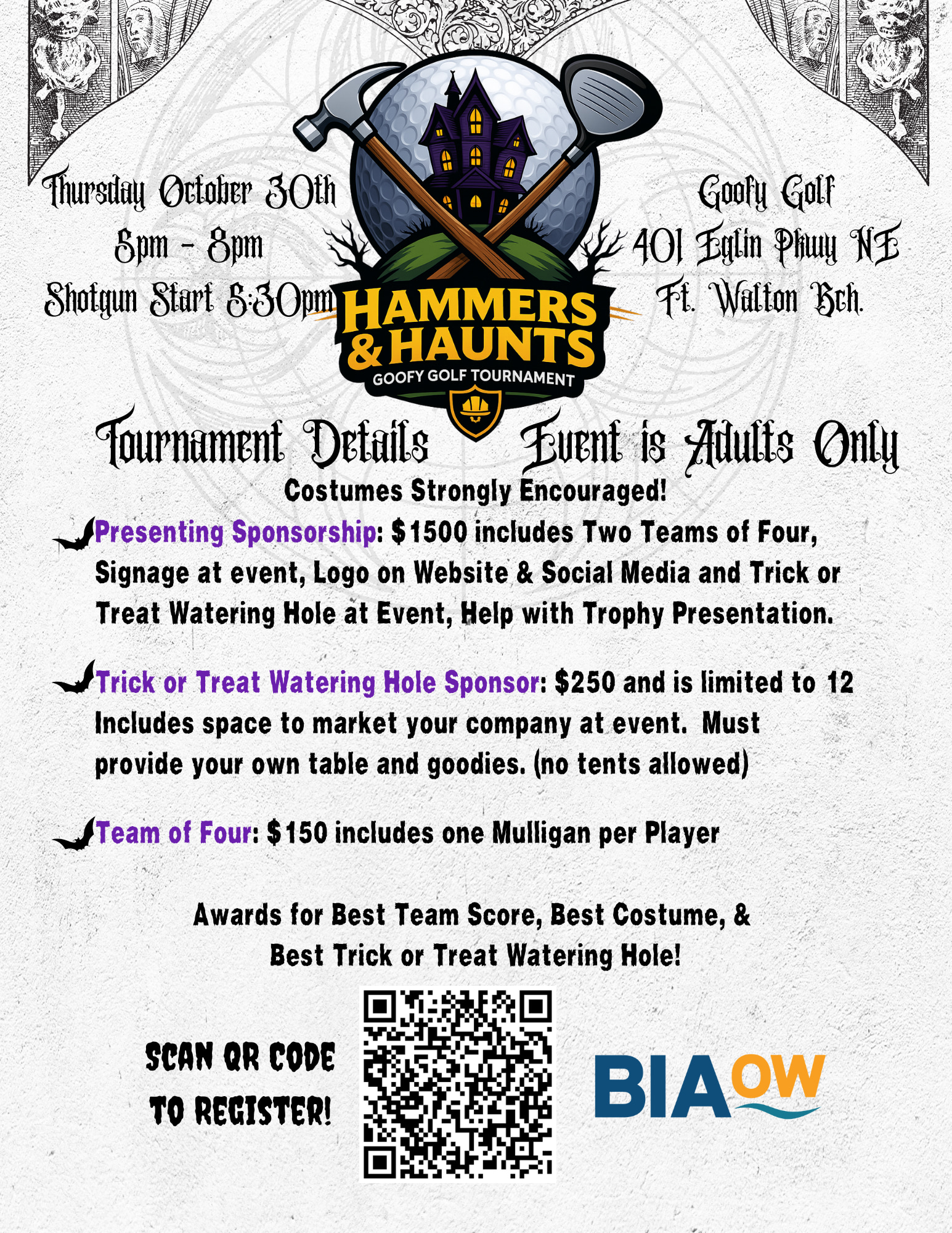 Thursday October 30th from 5pm - 8pm at Goofy Golf in FWB. Sponsorships available and Awards for Best Team Score, Best Costume and Best Trick or Treat Watering Hole!